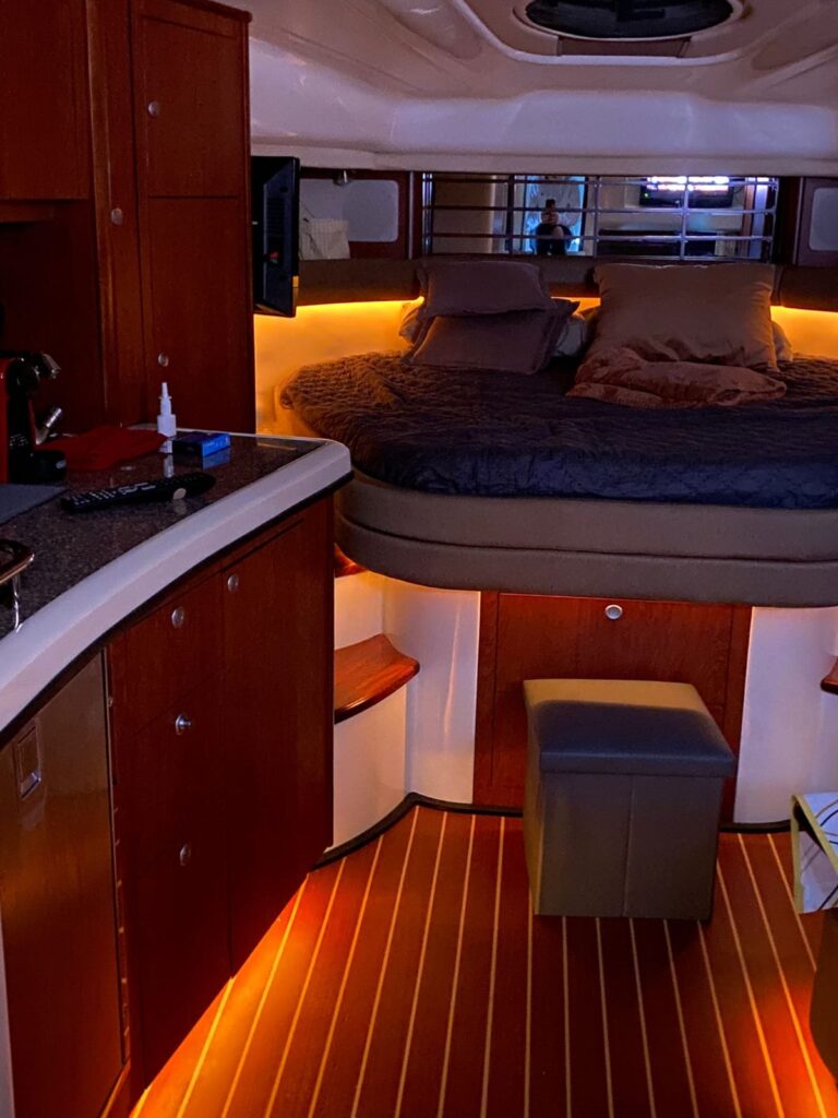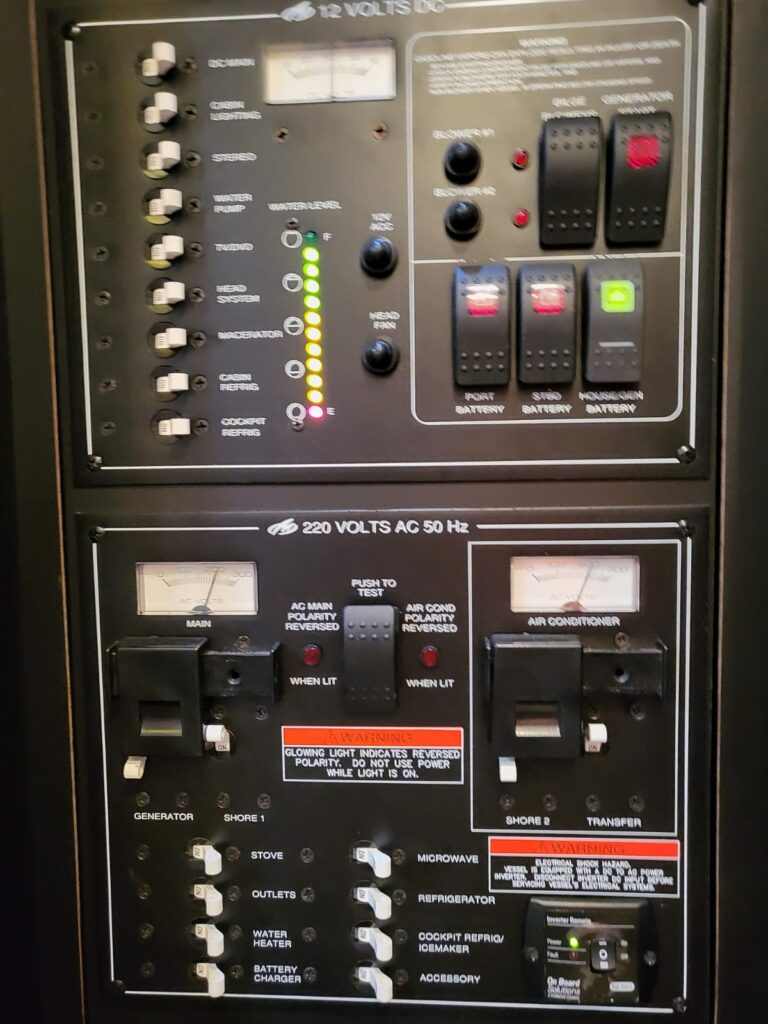 HOAS MOTOR  540    -GPS  – AIS   -Piloto automático     – Sonda  – VHF      – Bomba de Achique   -Escalera de baño                 – Equipo de seguridad   – Cañeros                          – Molinete eléctrico   –  TV       – Nevera Eléctrica           – WC marino           -Generador    – Aire acondicionado     – Horno  – microondas    -Helice de proa    -Deposito de aguas negras   –     Lona camper.